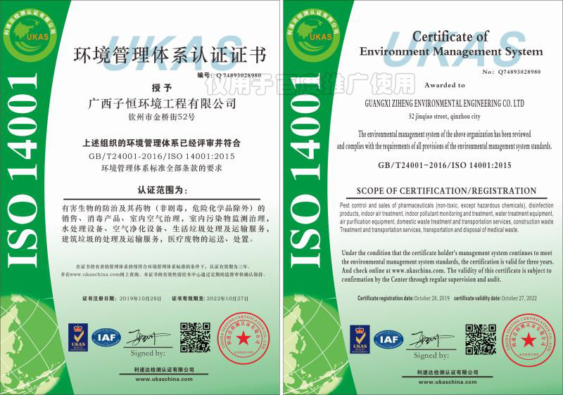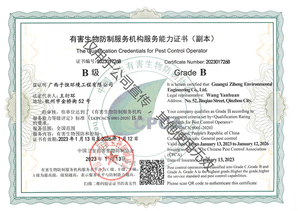 广西子恒环境工程有限公司,是一家以“绿色使命,一心为家”为宗旨,致力改善人类生存环境的公司。公司目前开展的服务项目有:有害生物防治、公共环境消毒、室内除甲醛、室内污染物检测治理、家用水与空气净化环保设备、污水处理,服务质量获得客户的广泛认可。在有害生物防制方面,公司拥有多名经验丰富的虫害防治专家和技术指导人员,针对每一个客户的实际情况提供安全、高效、专业的除“四害”(鼠、蟑,蚊,蝇)及灭白蚁、灭红火蚁等虫害消杀服务。目前,我公司已为钦南区政府、钦北区政府、自贸区钦州港片区管委、钦州高新技术产业开...
